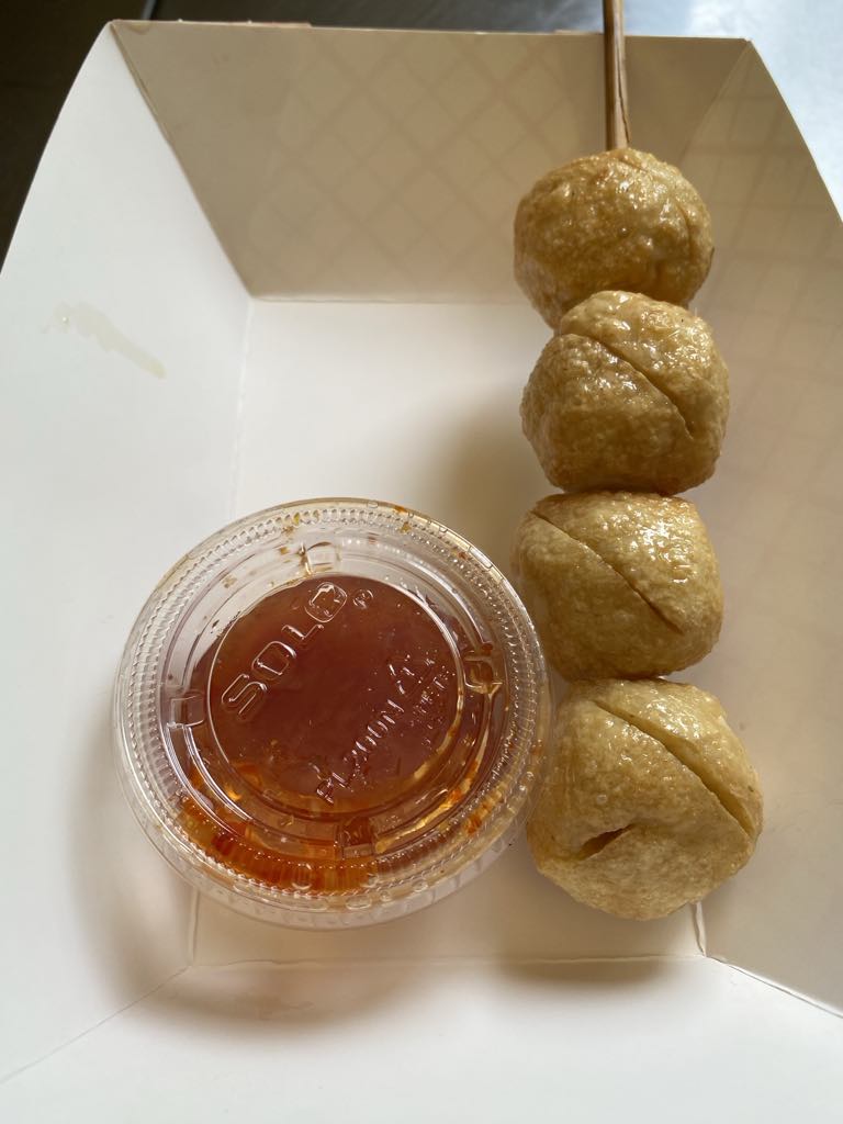 Four fish balls deep fried. Served with Thai sweet and chilli sauce.